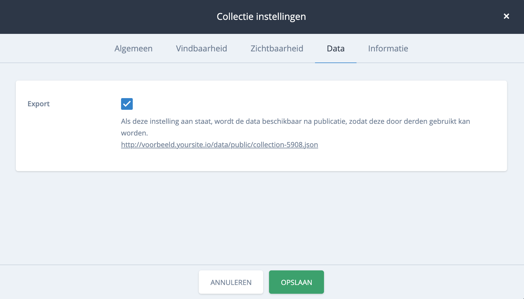 Wanneer de website gepubliceerd is en de dns is ingesteld dan wordt de export URL getoond in bovenstaande scherm. Deze URL wordt getoond op het moment dat het vinkje "Export" aanstaat. Hiermee voorkom je dat iedereen jouw data kan exporteren als je dat niet wil.