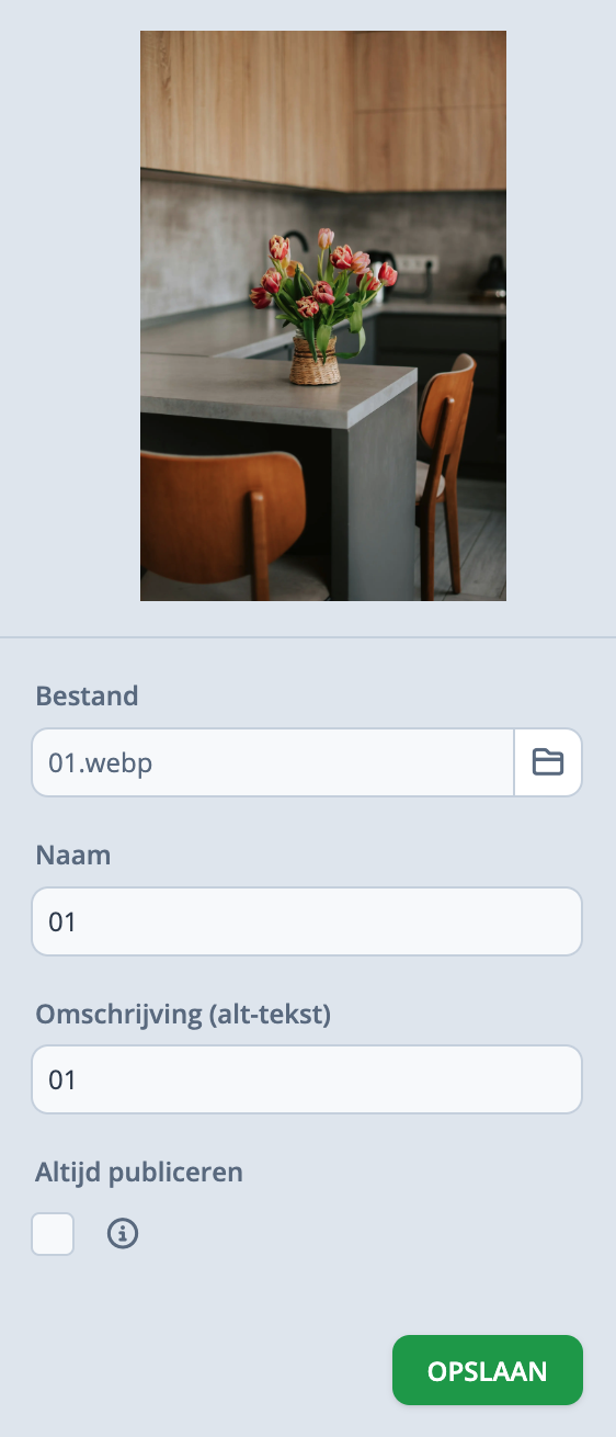 Het is voor zoekmachines van groot belang dat afbeeldingen een naam hebben die omschrijft wat er op de afbeelding wordt weergegeven. In Webtimized kun je de naam van een afbeelding eenvoudig aanpassen.