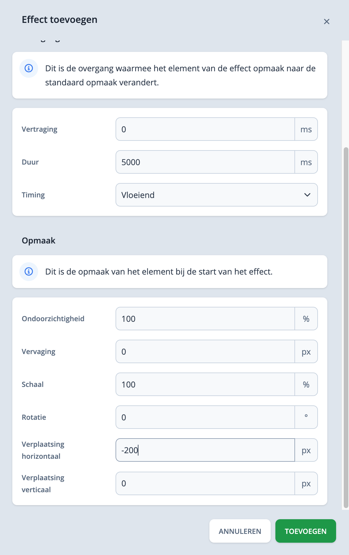 In Webtimized kun je met effecten dynamiek toevoegen aan websites. Alle effecten werken op basis van CSS. Hierdoor zijn effecten vloeiend en supersnel. De tijdsduur van effecten wordt gemeten in milliseconden (ms). 1 seconde is 1000 milliseconde.