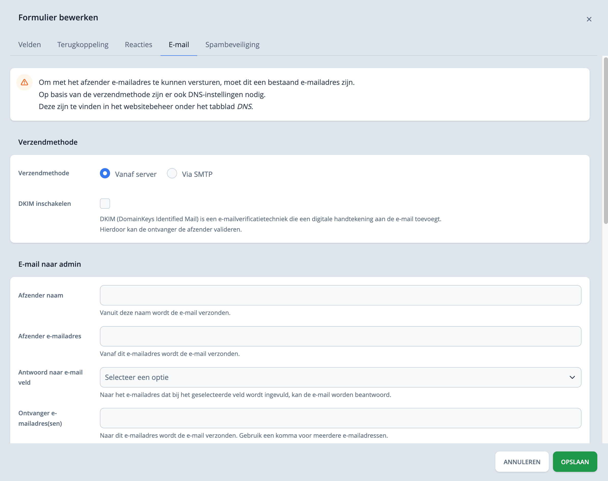 Om te zorgen dat de formulieren aankomen bij de ingestelde e-mailadressen is het belangrijk om een SPF record in te stellen. Lees meer over SPF records instellen.