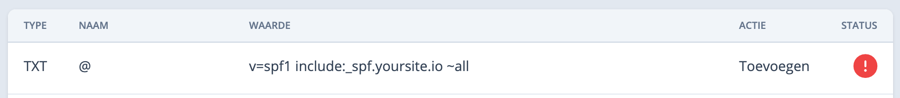 Op deze pagina wordt het SPF record getoond onder de andere DNS instellingen welke nodig zijn om de website online te zetten. Webtimized haalt de bestaande SPF recordinformatie op en voegt hier de benodigde informatie voor de formulieren op de website aan toe. Neem dit SPF record dus exact over.