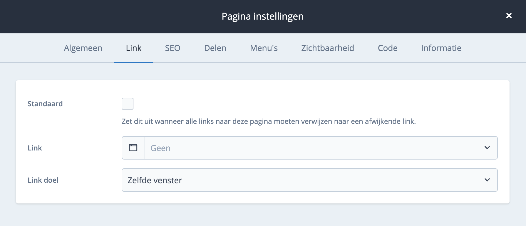 Iedere pagina heeft een standaard link naar de eigen pagina. Deze link kan uitgezet worden en indien gewenst worden verwezen naar een andere pagina. Indien de standaard link uitgezet is dan heeft de betreffende pagina in het menu geen link.