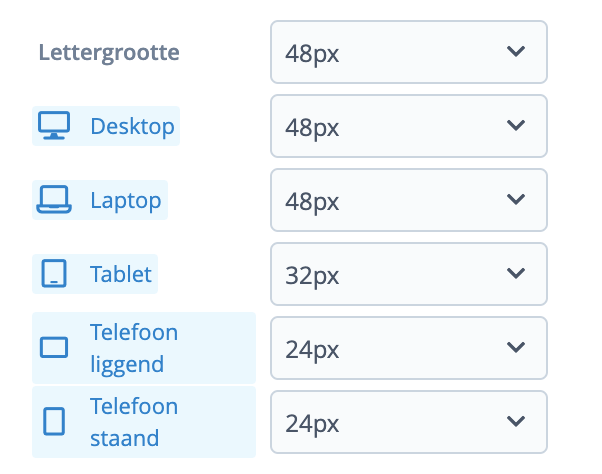 Ondanks dat de diverse blokken standaard responsive zijn in Webtimized kun je de opmaak per device finetunen. Zo kun je een tekst zeer groot tonen op de desktop en op smartphone kiezen voor een kleinere tekst of zelfs een ander lettertype. Onderstaande video toont hoe je per device de opmaak kunt finetunen.