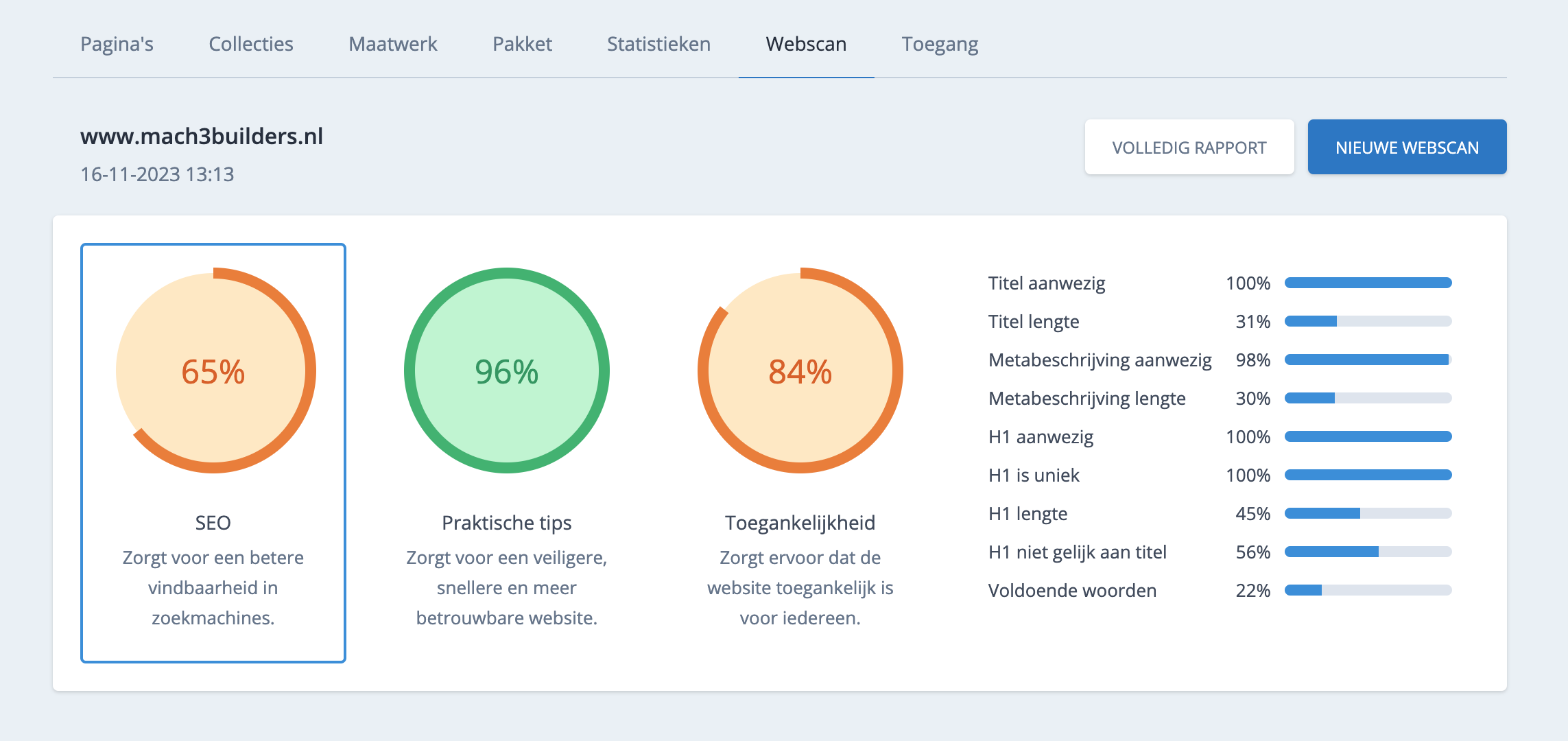 De webscan wordt uitgevoerd op drie niveau's: SEO, praktische tips en toegankelijkheid.