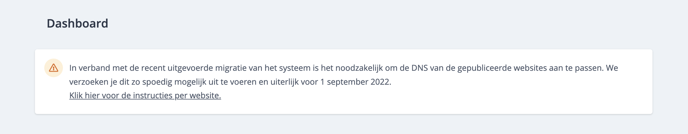 Door de migratie welke heeft plaats gevonden op 3 juni (00:00 uur) dient de DNS van gepubliceerde websites te worden aangepast. Op het dashboard van jouw Webtimized account vind je instructies voor het aanpassen van de DNS per gepubliceerde website. Wanneer de DNS van een website is aangepast zal deze automatisch van het overzicht verdwijnen. Dit kan maximaal 24 uur duren in verband DNS caching.