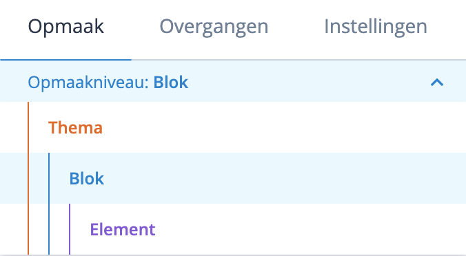 Opmaakniveau's: Thema, blok en element