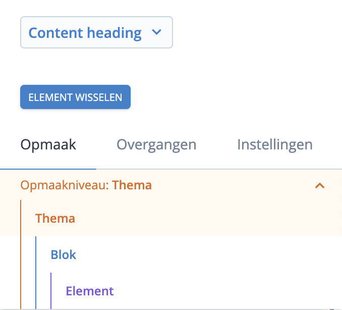 Wil je een element in één keer vormgeven voor de gehele website dan selecteer je niveau "thema". Op die manier kun je supersnel de gehele website voorzien van de stijl welke jij wenst. Heb je echter specifieke wensen voor een bepaald element op de pagina dan kun je deze uniek stijlen voor dat ene element. In dat geval selecteer je niveau "element".